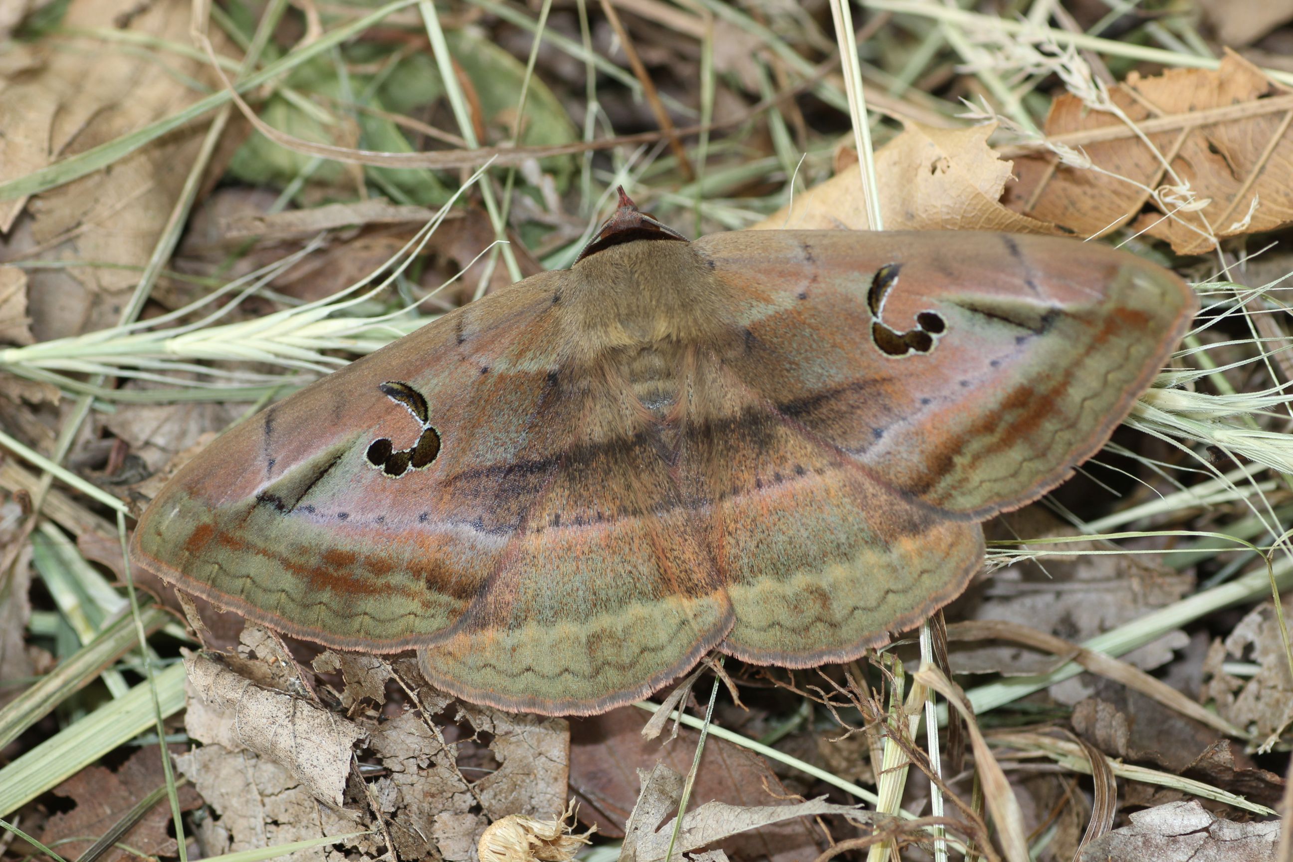 オスグロトモエは通常年2化で第一化(春型)の個体ではオスとメスで斑紋の差はなく、写真のように腎状紋が整った巴型にはなりません。