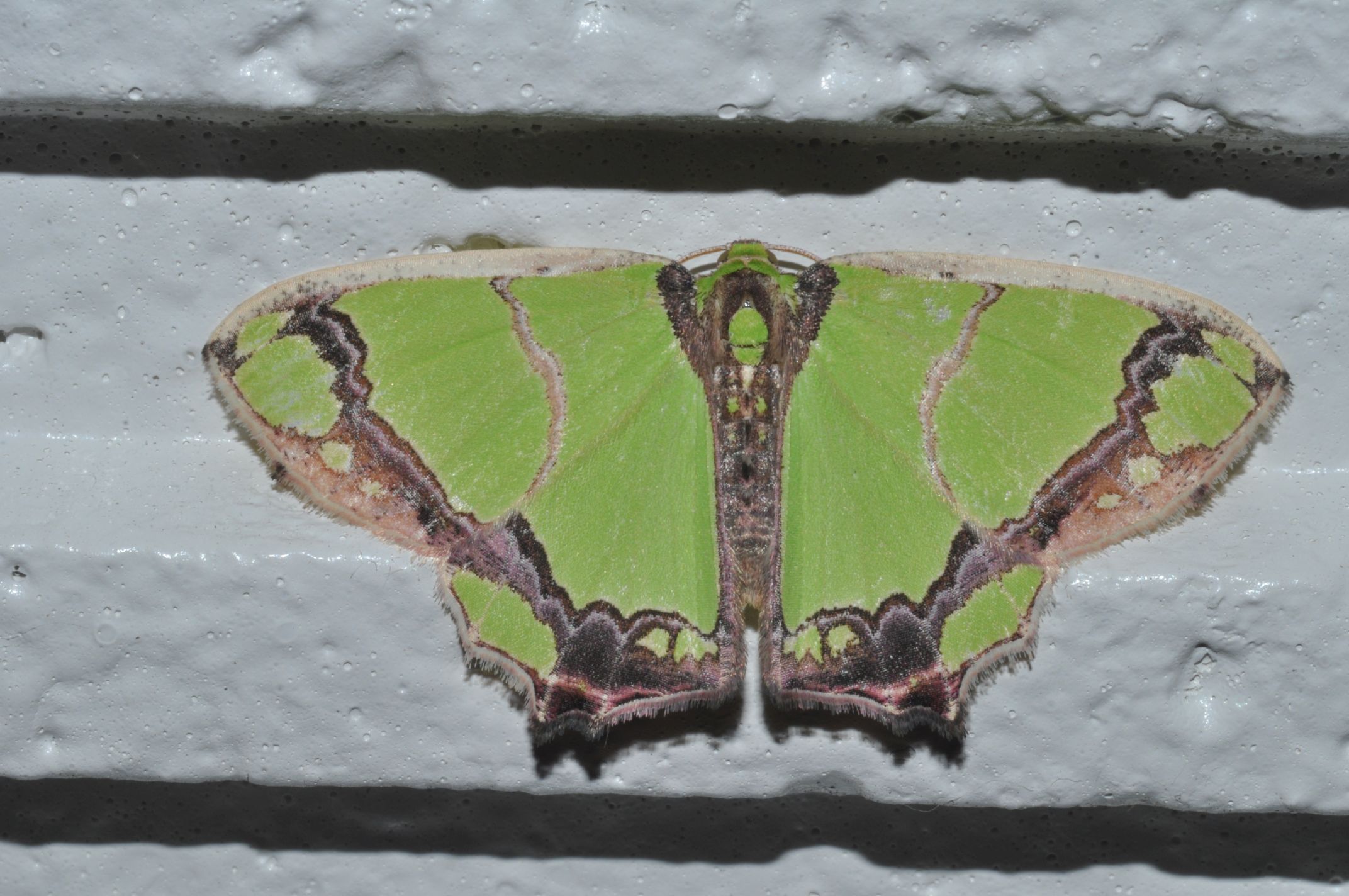 緑色が非常に鮮やかできれいな種類です。次のアシブトチズモンアオシャクと似ていますが、本種では前翅の中央付近の褐色の帯が前翅の後縁付近で外側に緩やかに湾曲して、前翅の後縁とは浅い角度で交わるのに対して、次種ではほぼ直角に前翅後縁に達します。