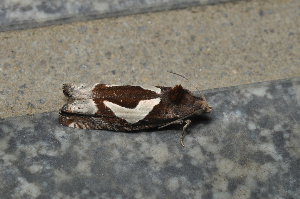 小さな蛾ですが、こげ茶色の中に太い折れ曲がった白い帯が入っているので、離れた位置から肉眼で見ただけでも識別ができます。この白帯の形にはバリエーションがあります。