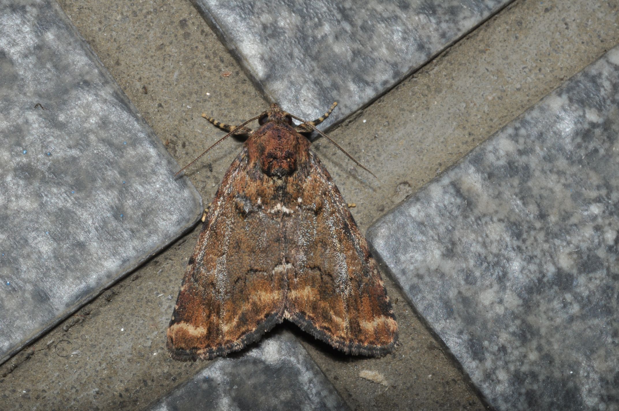 色彩や斑紋の変異がかなり顕著な種類のようです。写真の個体は前翅の地色は茶褐色ですが、灰色に近いものや黒に近いものなどもいます。また、写真の個体では腎状紋や環状紋はほとんど目立ちませんが、これらの斑紋がはっきりと表れる個体もいます。