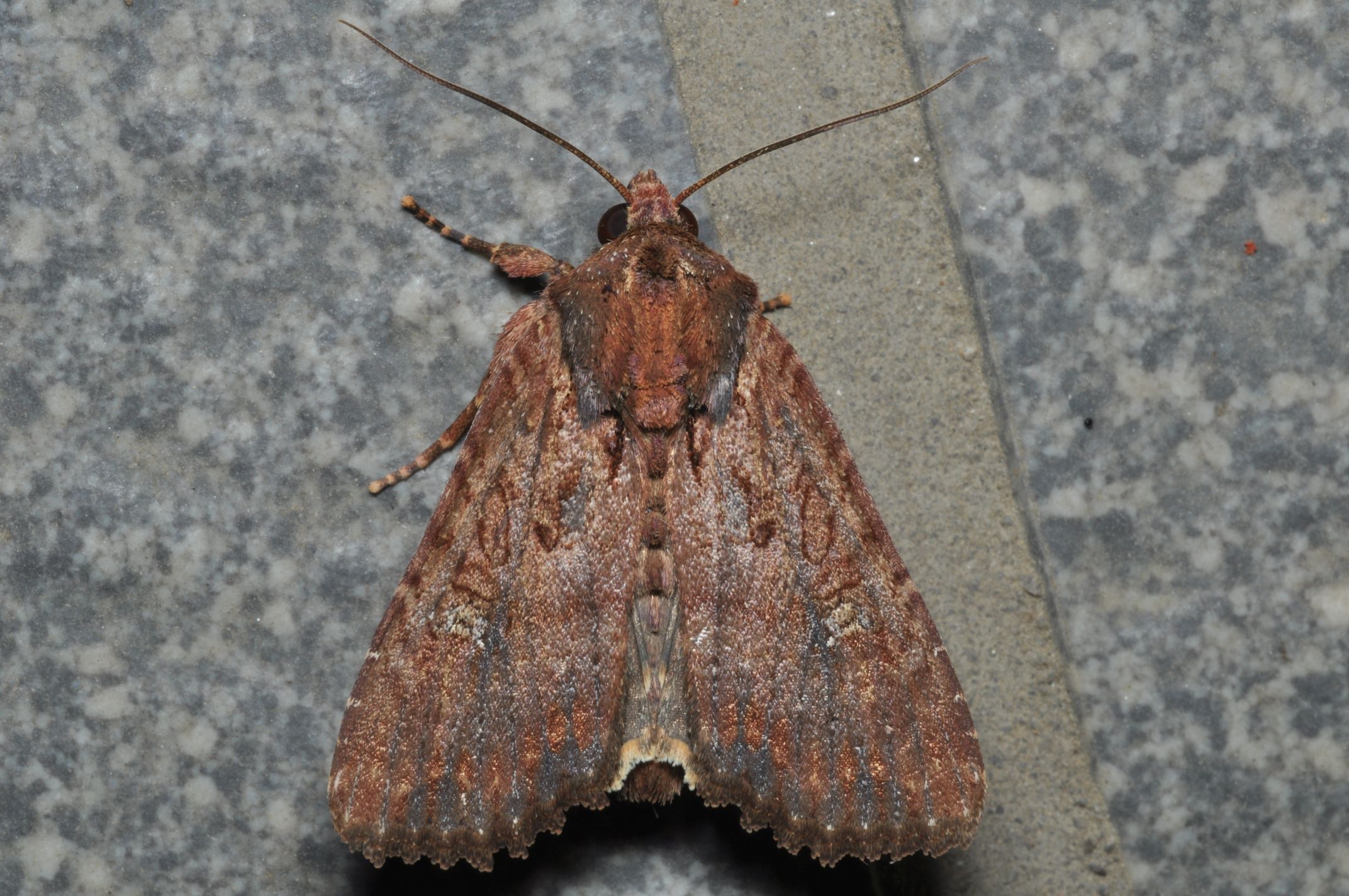 名前の通り赤みの強い褐色をしています。保育社の蛾類図鑑によると、成虫の出現時期は5月〜8月。