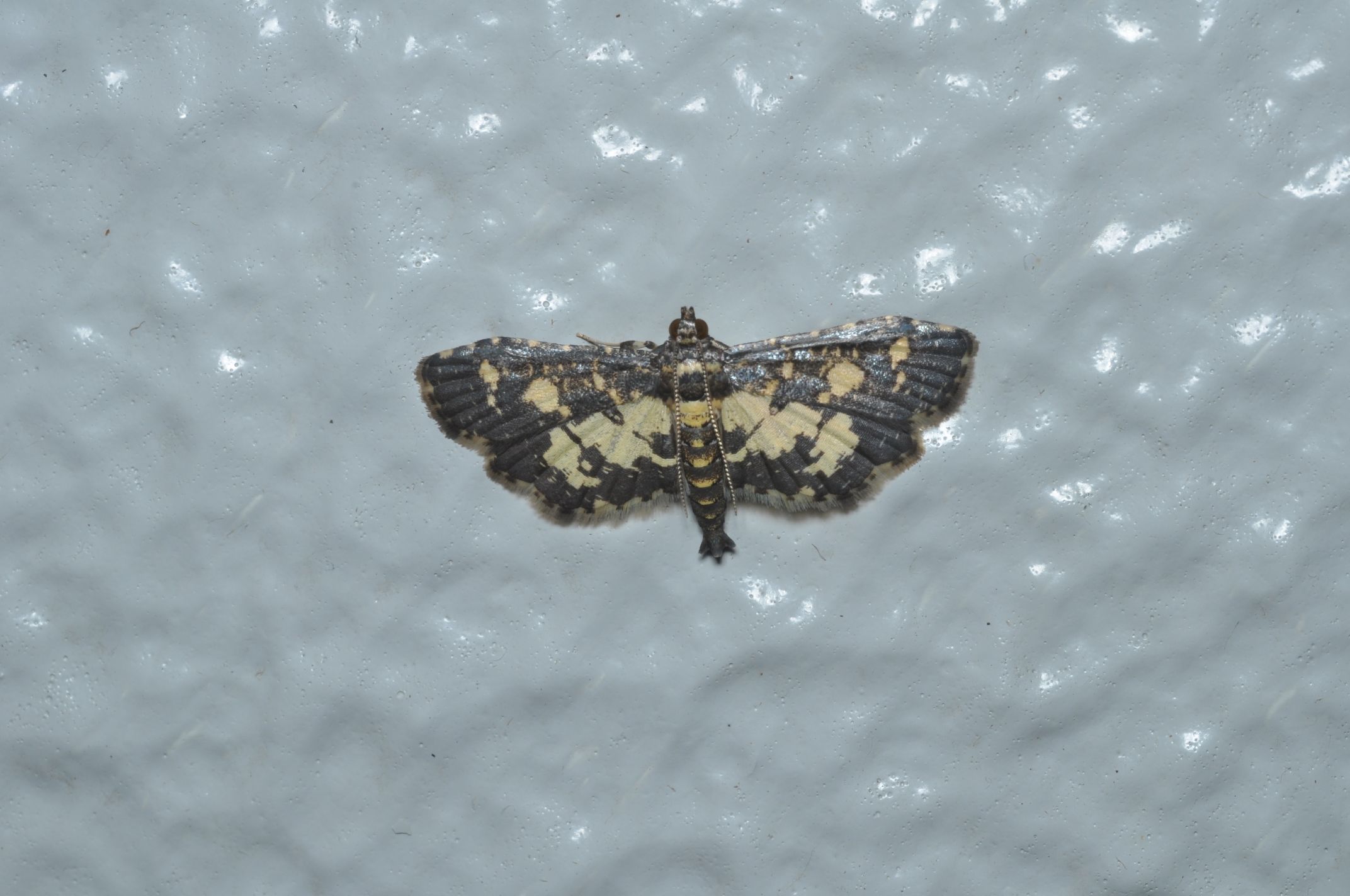 アヤナミノメイガは写真のように翅をほぼ水平に広げて止まります。