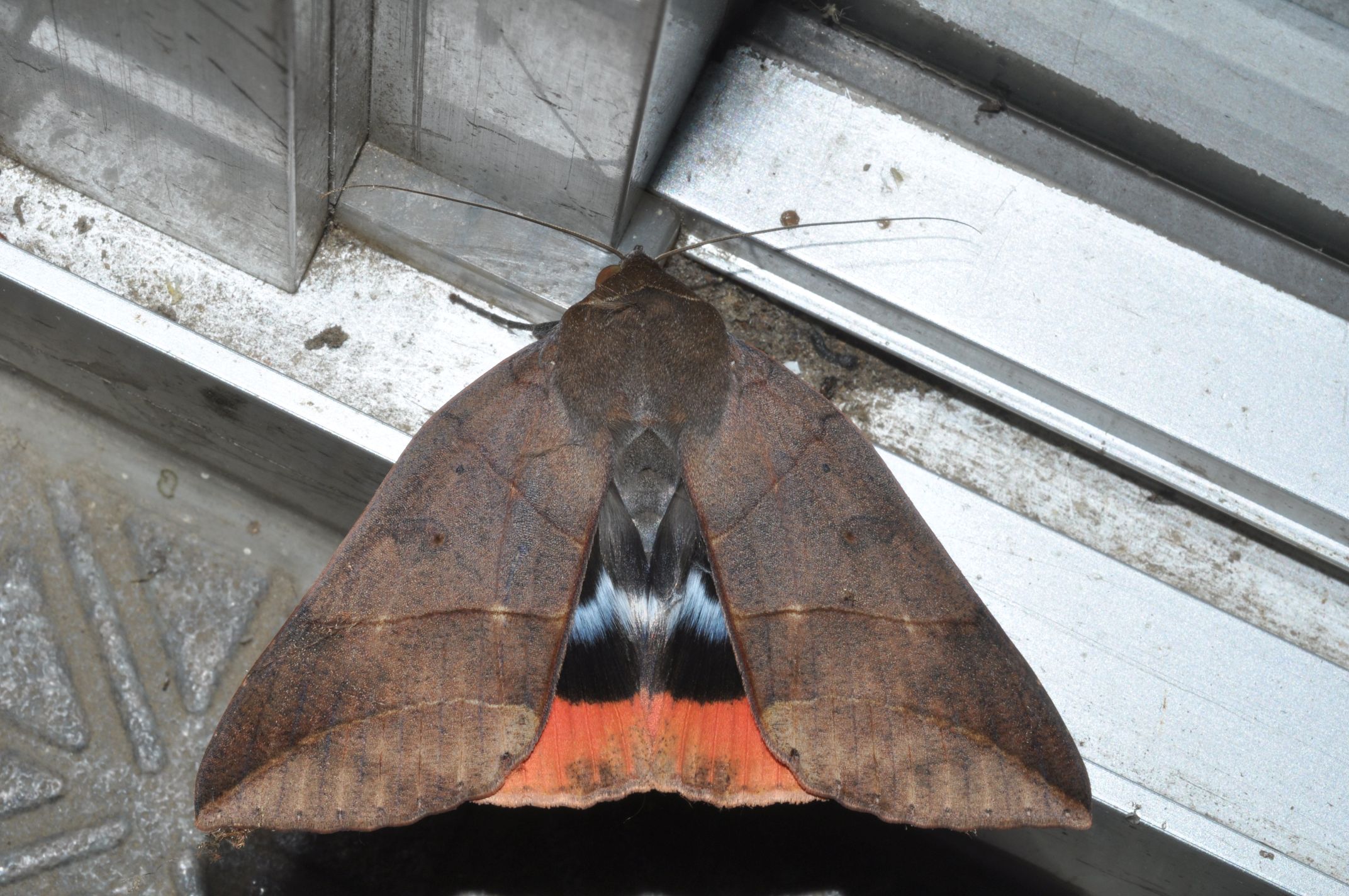 前翅長が約43mmある大型の蛾です。後翅の赤と黒、水色のコントラストがドキリとするほどきれいです。