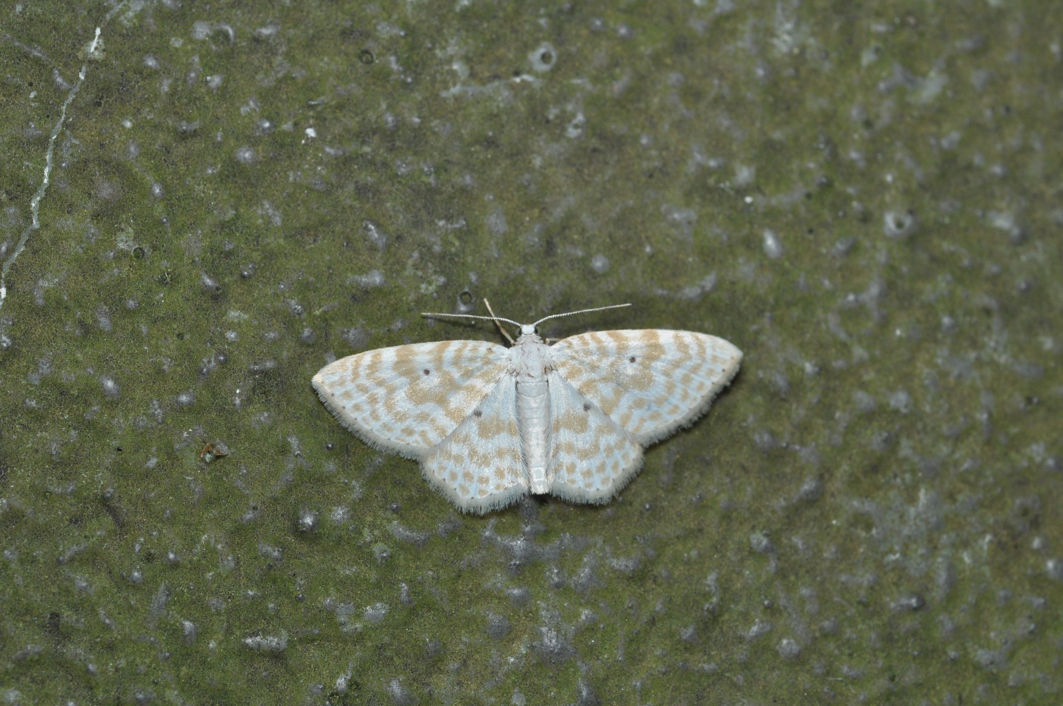 白地に黄褐色の波型の斑紋があり、前翅と後翅にそれぞれ1対の黒い点があります。また、翅の外縁にも小さな黒点が並んでいます。翅を広げた状態での左右の先端のさし渡しの幅は約20mm。前翅長では、約9mm。幼虫の食草はミズキ類。