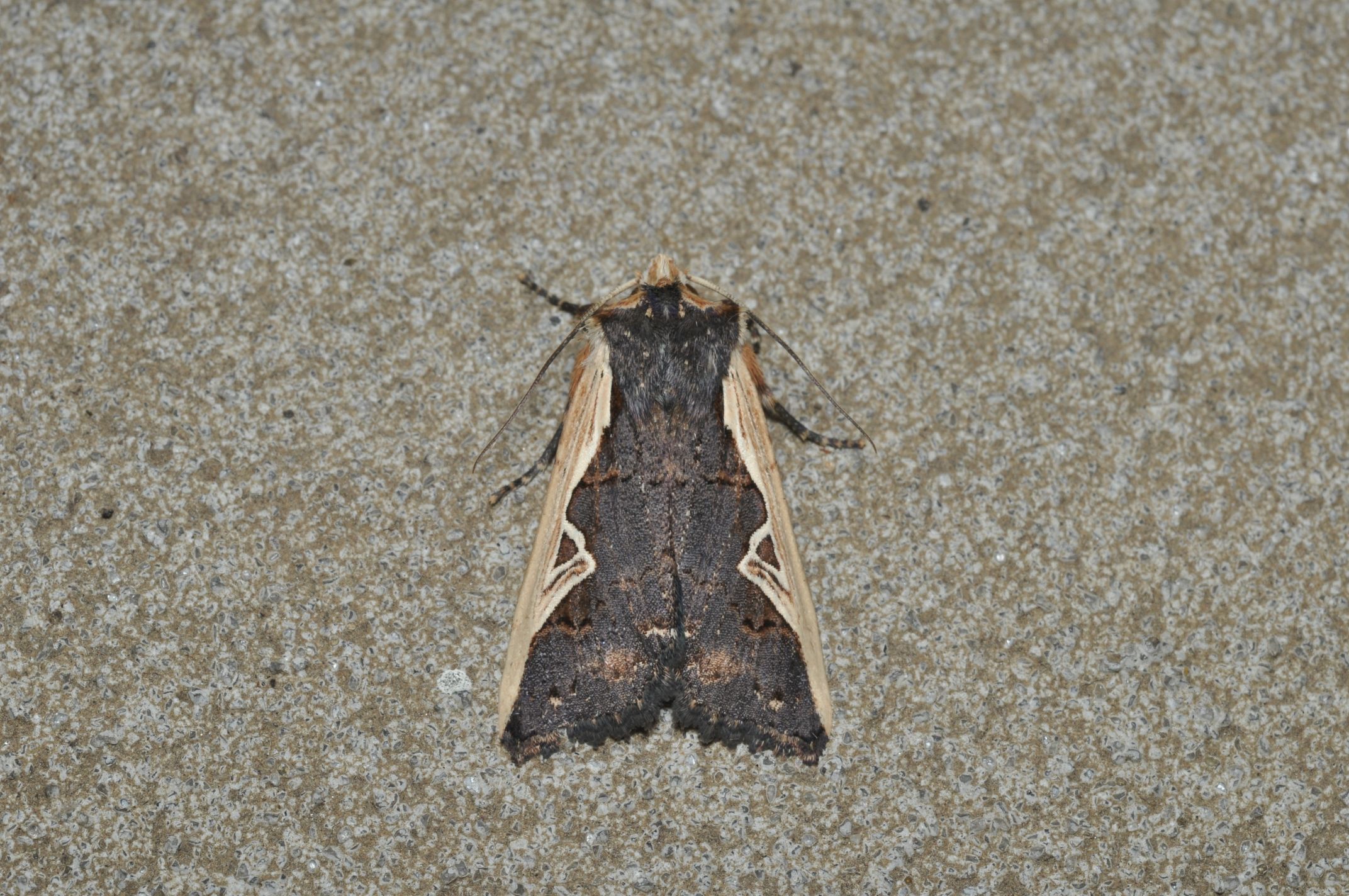 前翅の前縁が乳白色の帯で縁どられているので、この時期に良く見られるヤマノモンキリガだと思って見逃すところでした。