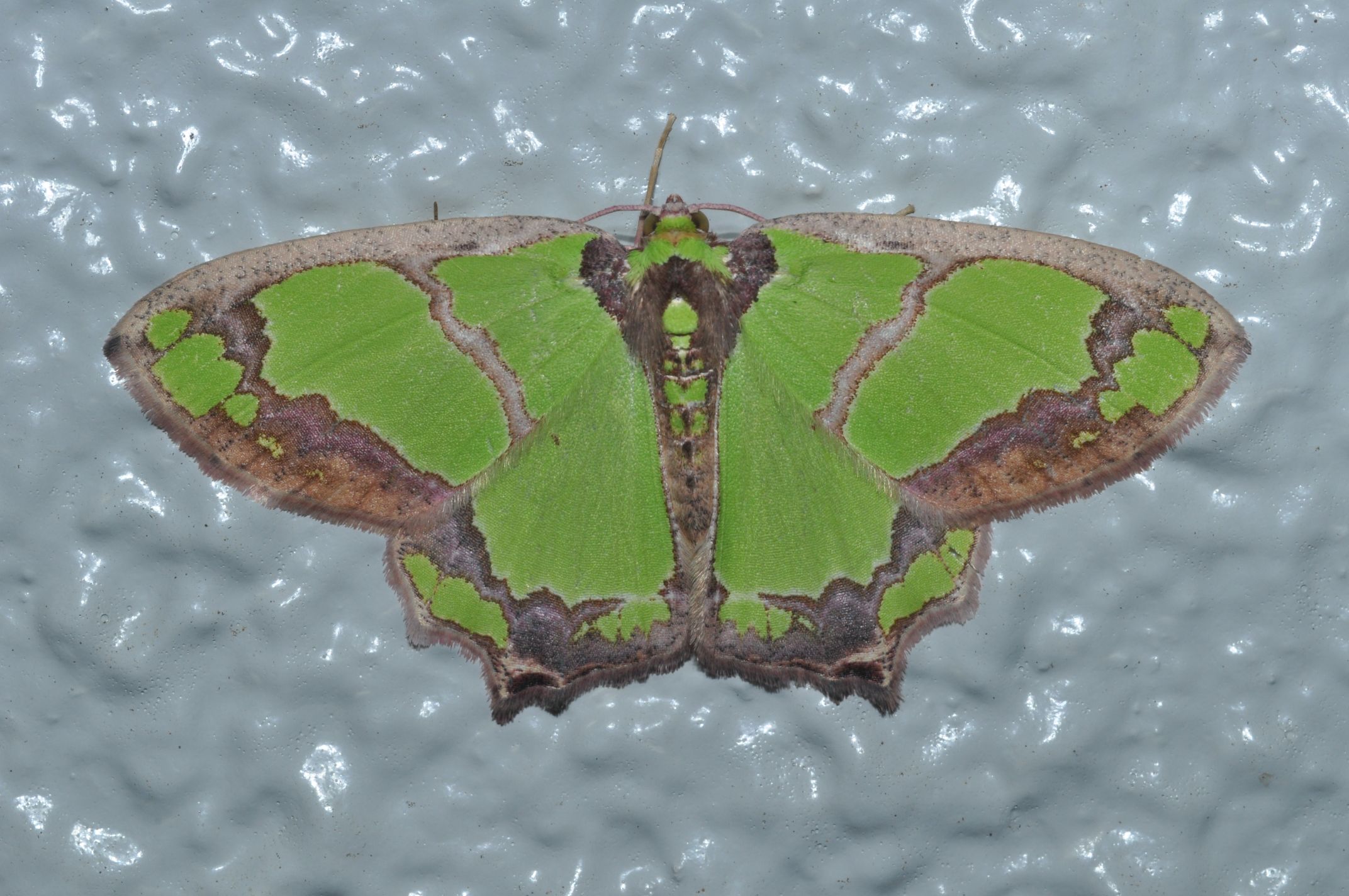 前翅の中央部の緑色の部分が台形状に外側に突出することも、前種との識別ポイントの一つです。また、前種よりも緑色が濃いようです。