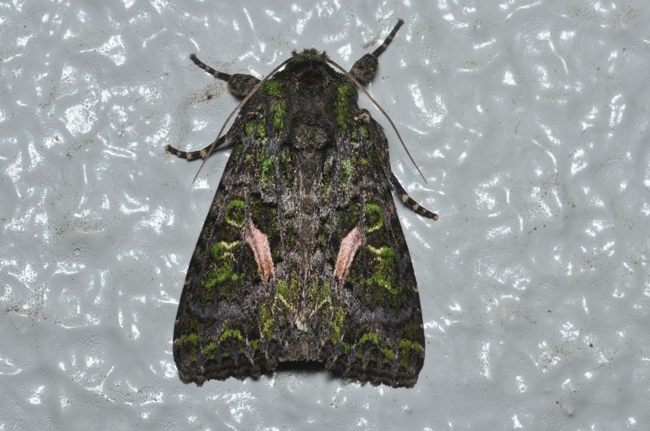 黒褐色の地色にちりばめられている鮮やかな緑色の斑紋は、木肌に生える苔を模しているようです。団地の壁に止まっているときには苔模様は全く役に立ちませんが、樹木の木肌に止まっているときは効果絶大です。