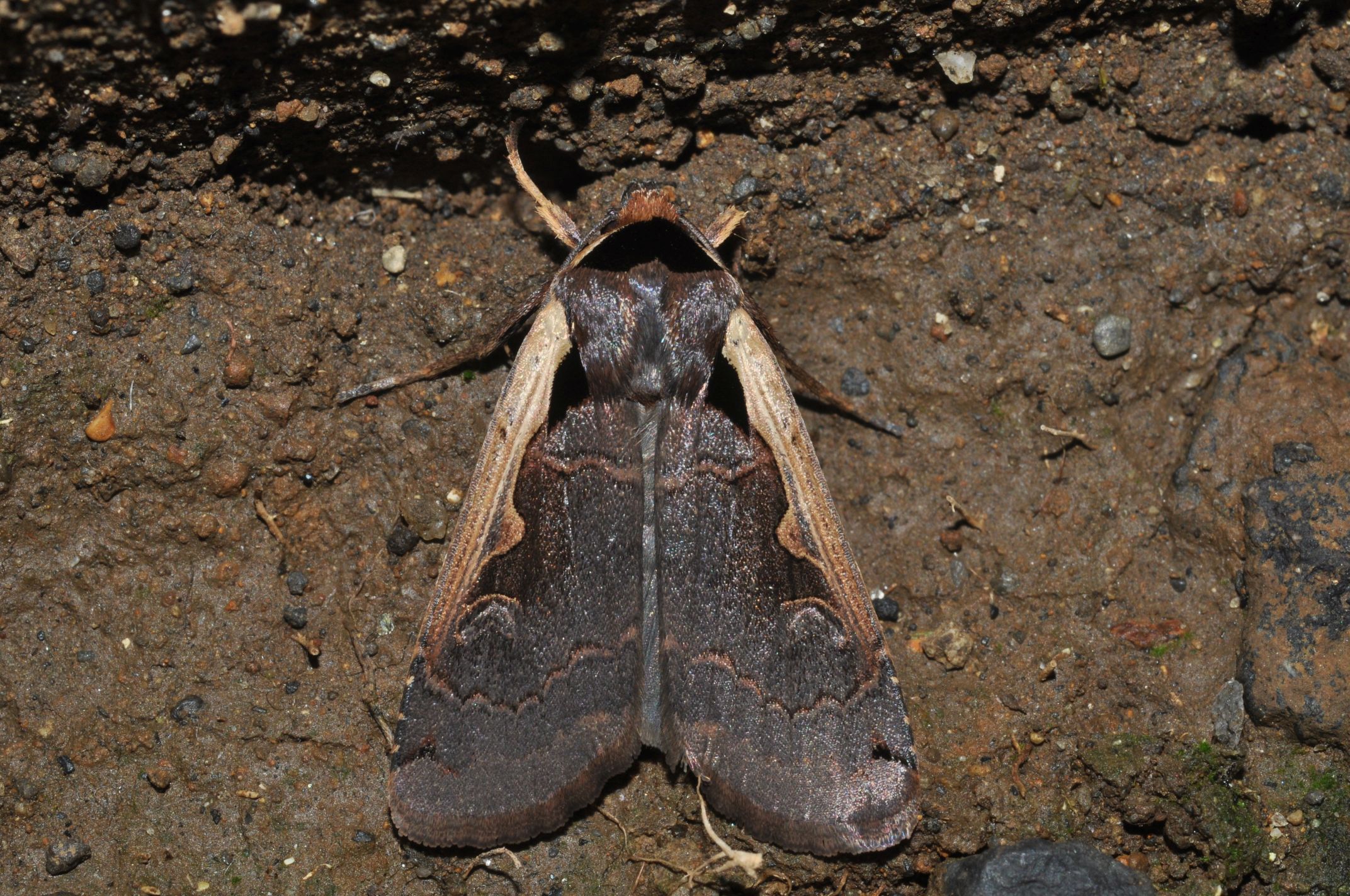 上面から見ると、頭部は淡い橙黄褐色、胸部の前部はくっきりとした黒、胸部後半は栗色をしています。前翅の前縁は淡黄褐色をおび、前翅の付け根には黒い三角形の斑紋があります。