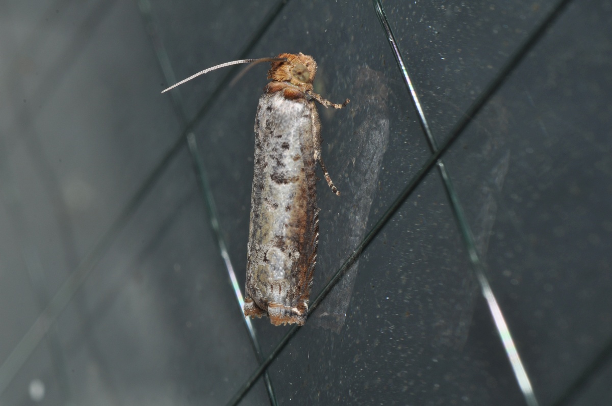 翅をしっかりとたたんで止まるので、止まっている姿は棒状に見え普通のヒメハマキとはやや様子が違って見えます。頭部がややオレンジ色を帯びた茶色なのが目立ちます。前翅長は10.1mm。
