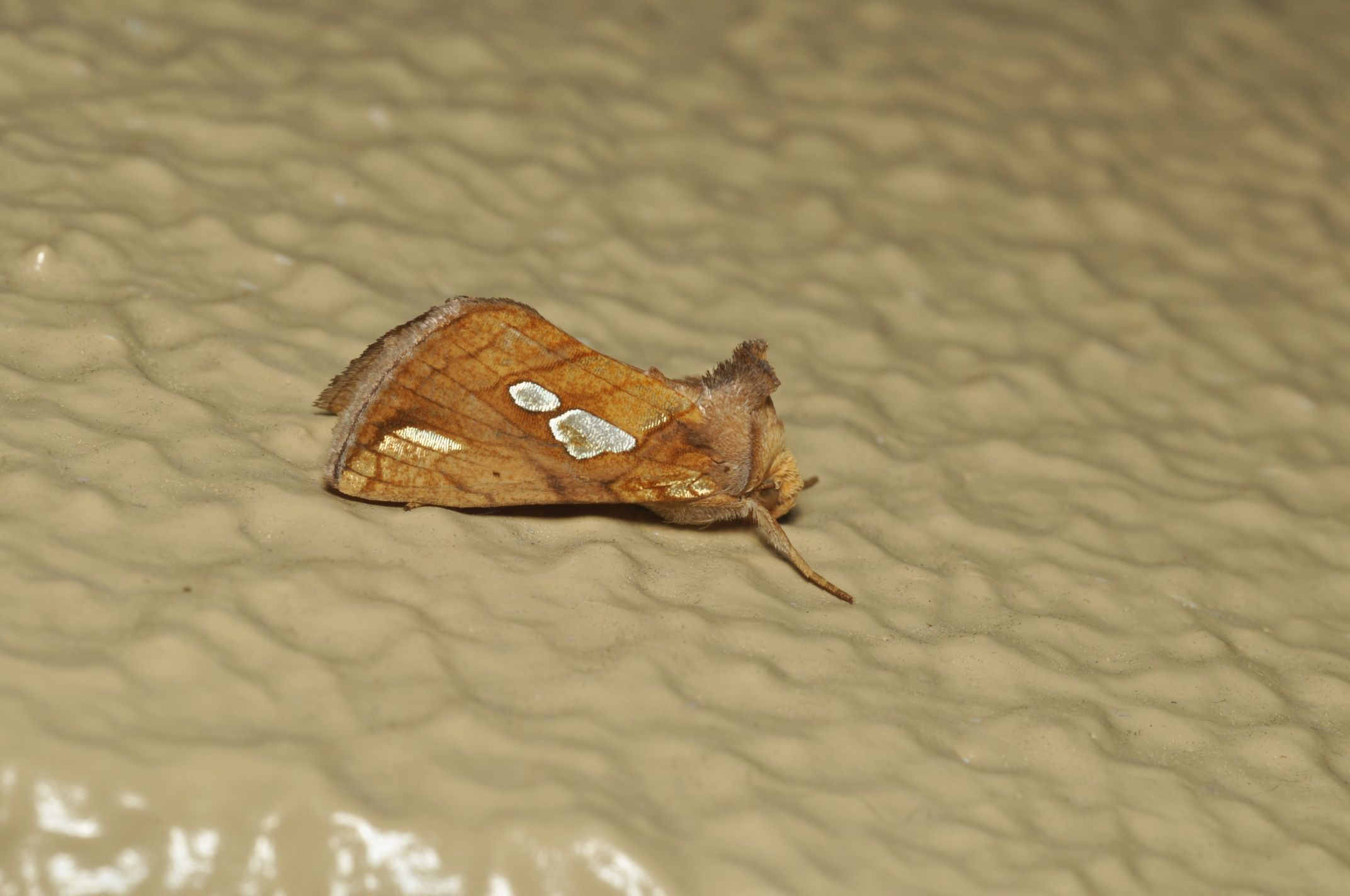 翅の色は明るい茶色で、前翅の中央に隣接した大小2個の目立つ銀白色の斑紋があります。幼虫の食草は、イネ、ガマ、スゲ。
