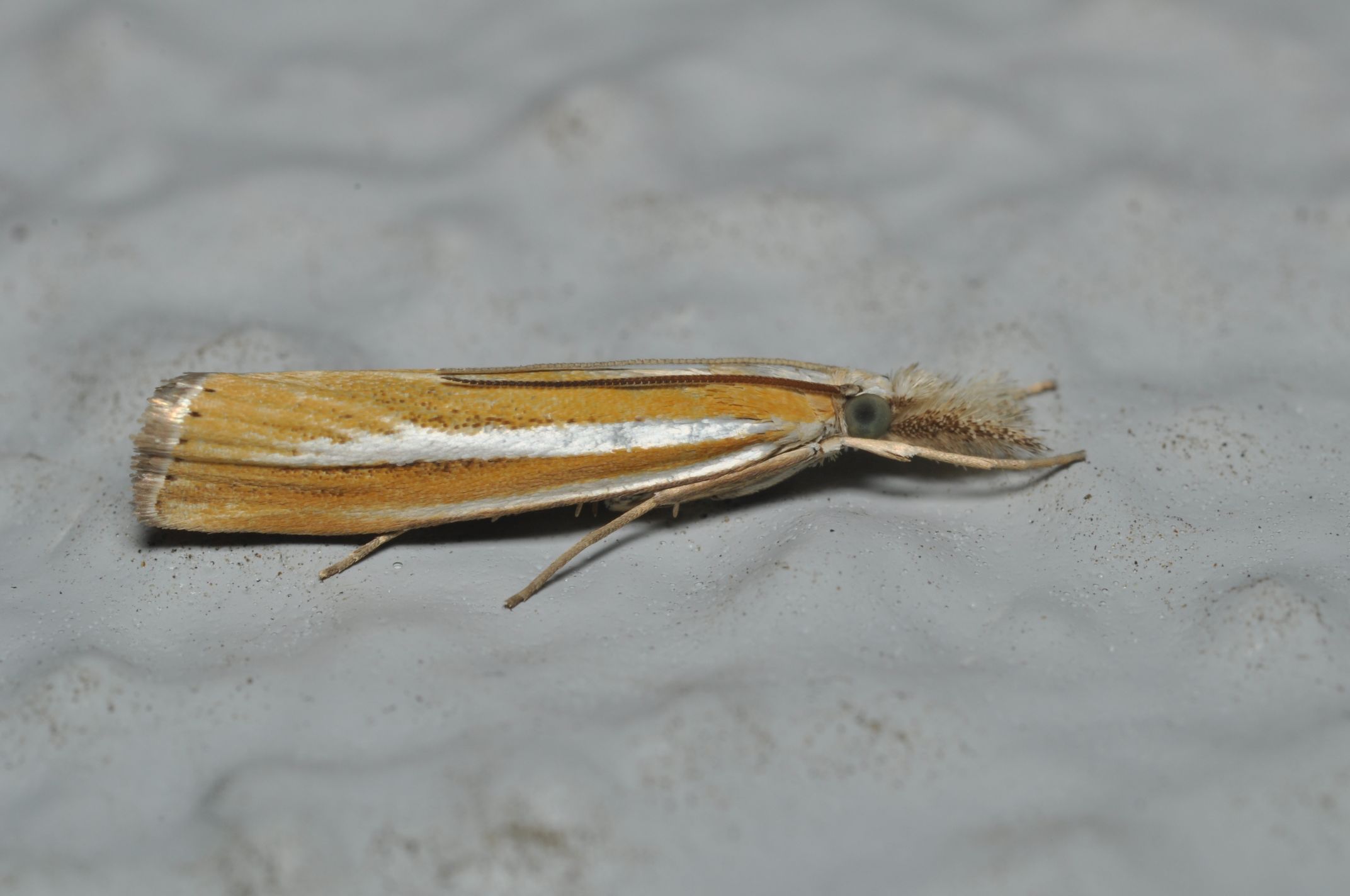 写真の個体の前翅長は11.8mm。前翅は黄土色で、名前の示すように中央部に白い筋があり、前縁にも細い白色の筋があります。保育社の原色日本蛾類図鑑(上)には掲載されておらず、webで画像検索しても標本写真が1件見つかったのみで、生態写真は見つかりませんでした。
