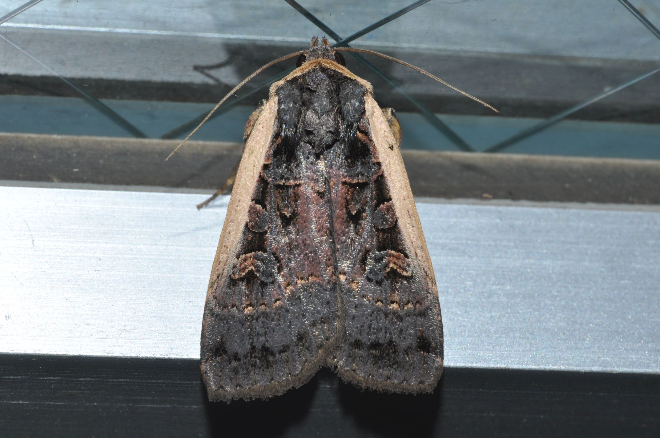 前翅の前縁が外横線まで淡黄褐色に縁どられ、その内側はやや青みを帯びた暗灰黒色をしています。成虫の出現時期は8月から9月。