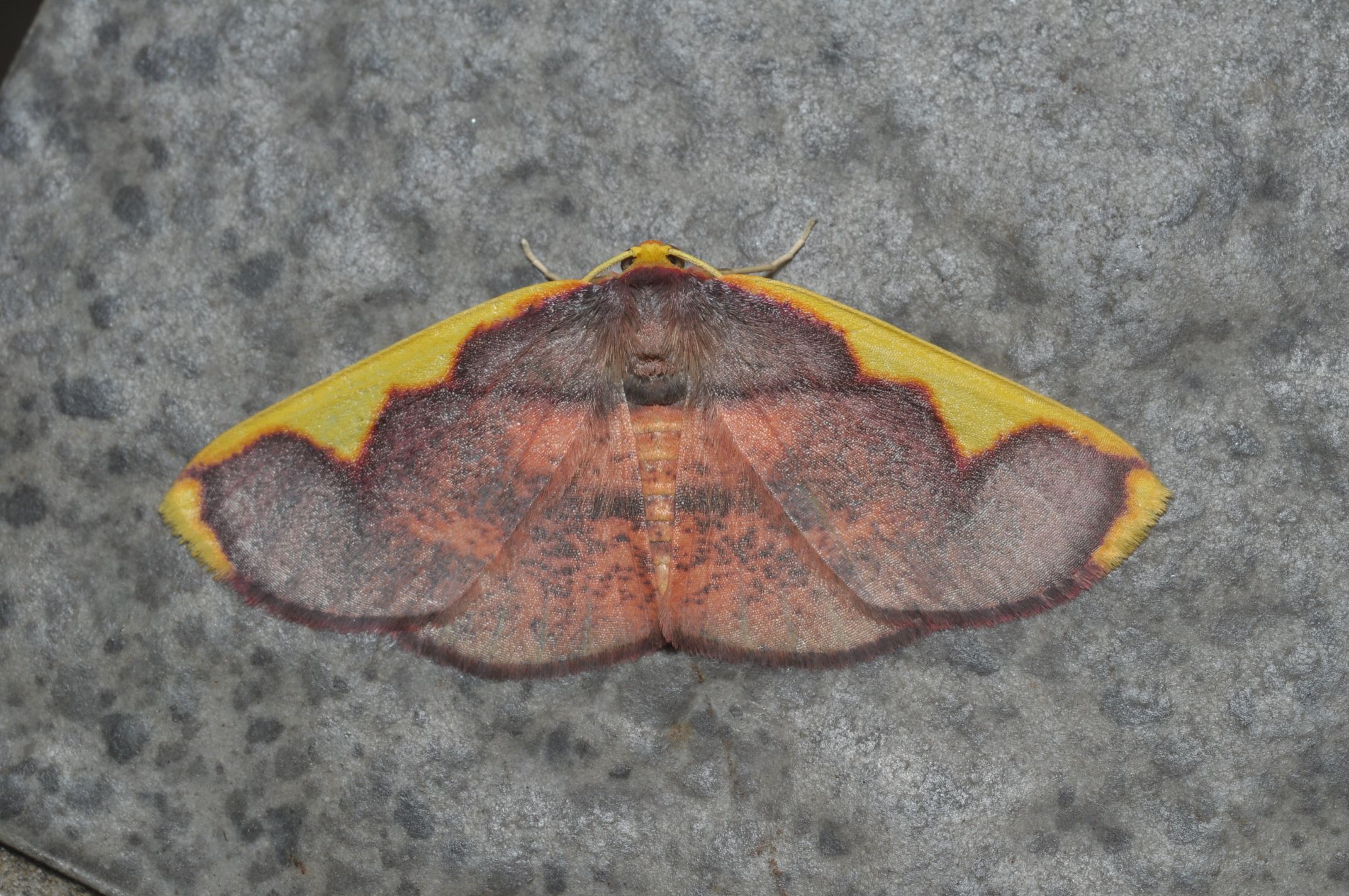 マエキトビエダシャクに似ていますが、識別のポイントはオオマエキトビエダシャクでは前翅の前縁の黄色が連続している点です。