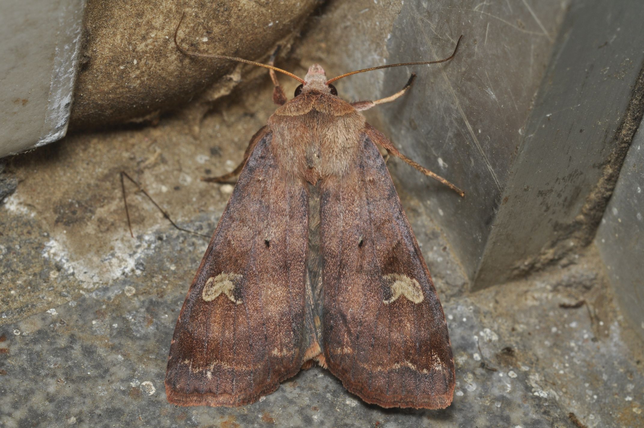 保育社の原色日本蛾類の解説では「メスはオオバコヤガのメスに似ているが、一般に紫褐色をおびるものが多く、従って腎状紋の淡黄褐色がよく目だつ。腎状紋の下端は濃色。」とあるので、コウスチャヤガのメスのようです。