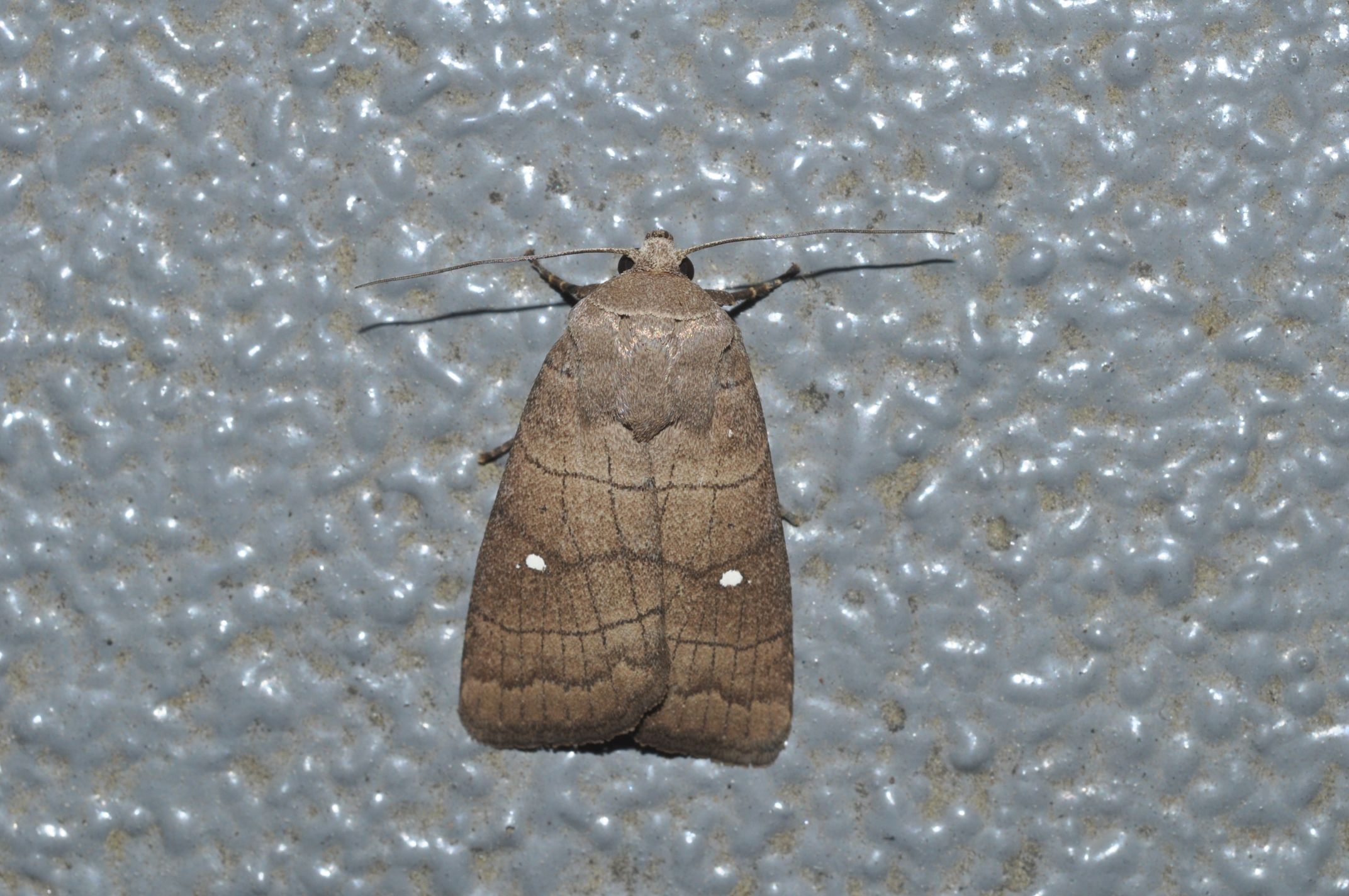 ヒメサビスジヨトウに似ていますが、本種では腎状紋の部分の白い紋が大きくはっきりしています。