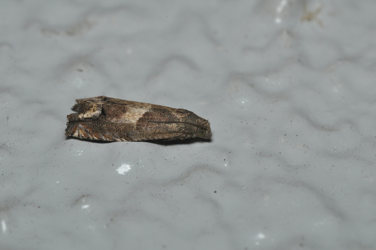 一見、黒褐色に見えるヒメハマキガ。前翅長は8.2mm。名前にスギとあるので、杉を食害するかと思いきや、幼虫は、オオブタクサやオナモミなどのキク科の植物の茎に潜り込んで芯を食べるそうです。