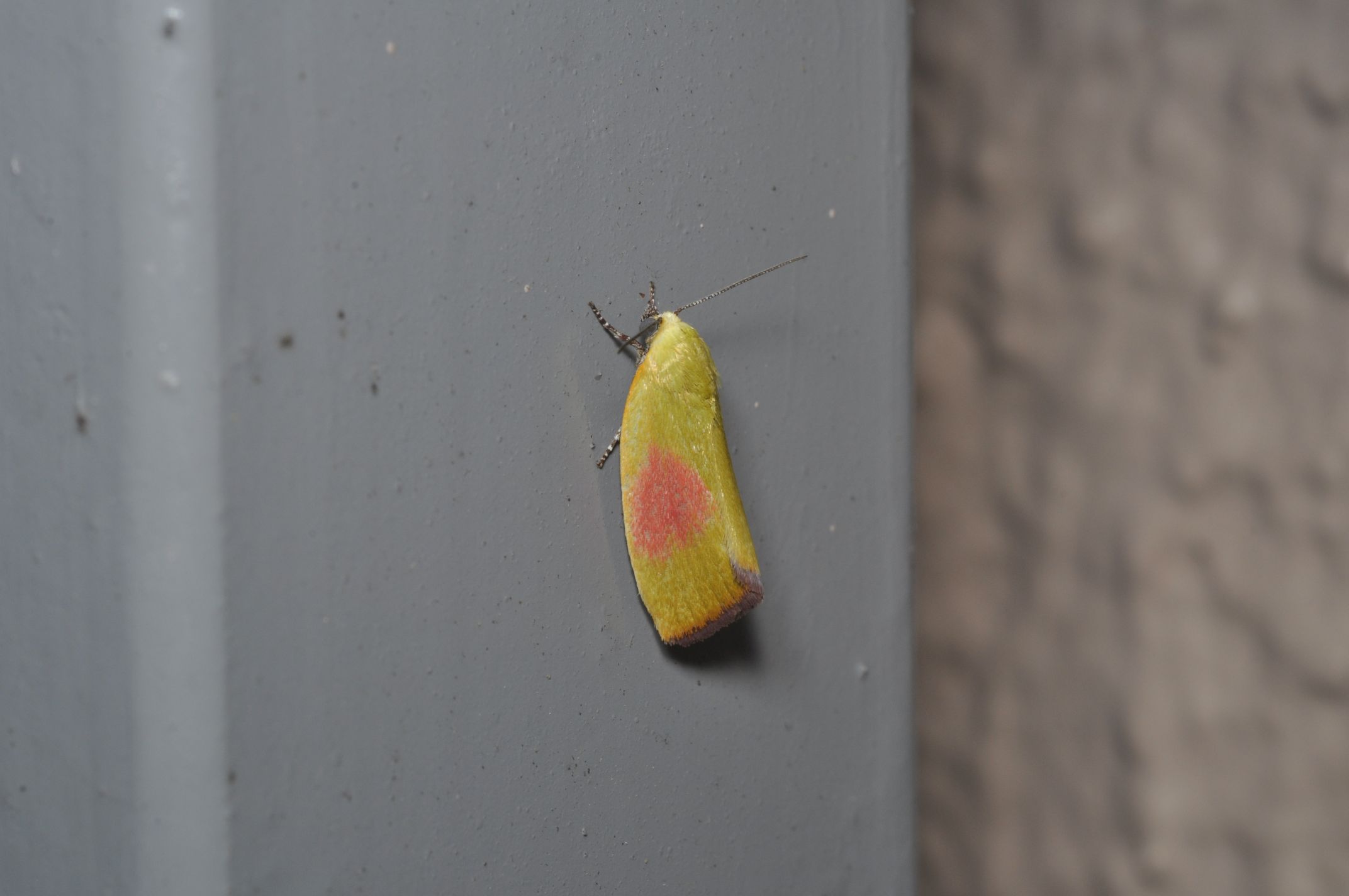 小型の蛾ですが、黄緑色の地にピンク色の斑がありとてもきれいです。ピンク色の斑紋の大きさは変異があり、写真のように良く目立つものから、次の写真のように全くなくなっている個体まであるそうです。