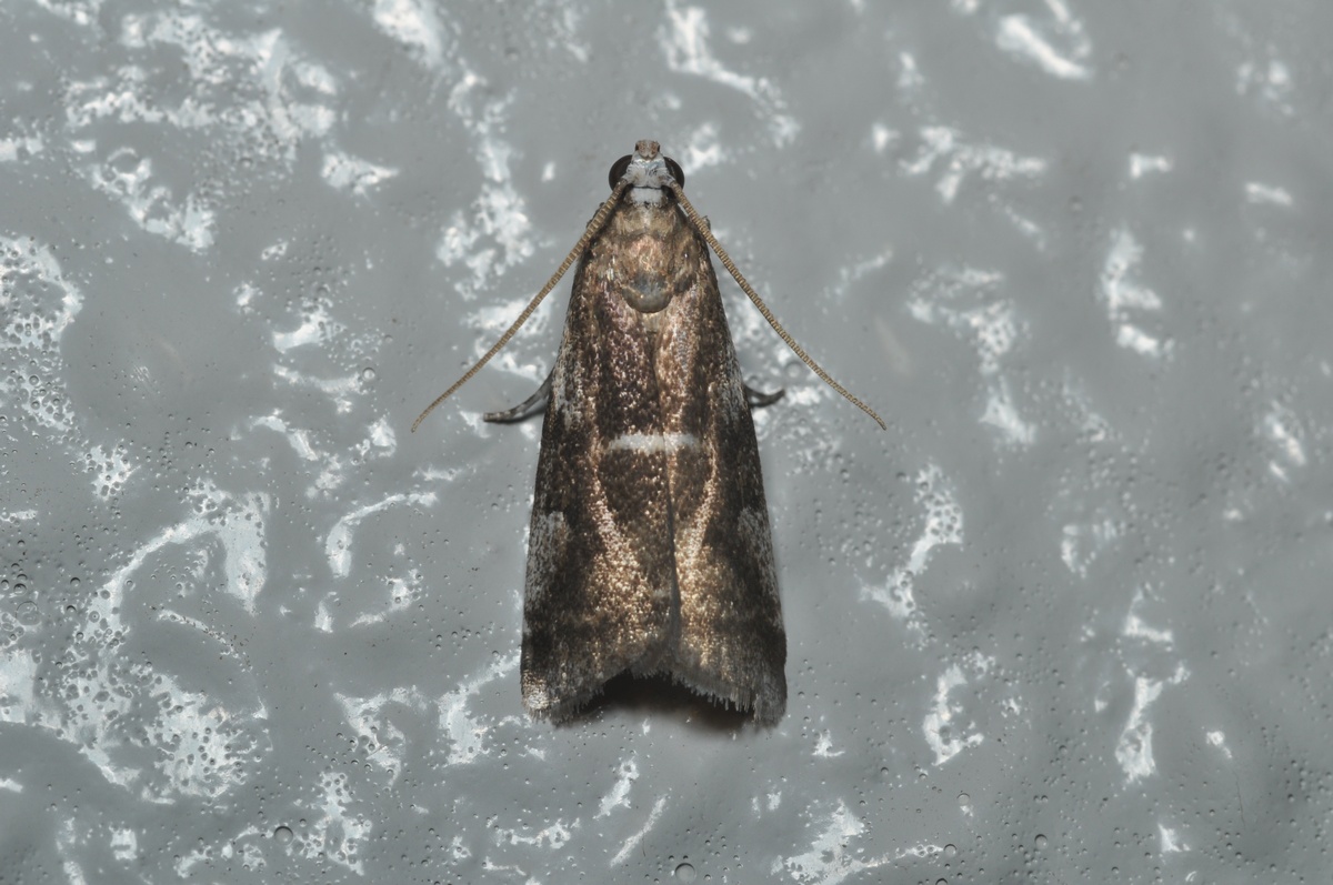 濃黒褐色の地色に白い帯状の斑紋が入っています。フタグロマダラメイガにやや似ていますが、本種のほうが白帯がよりくっきりしており、前翅前縁の翅頂手前にも白斑があるなどの相違があります。前翅長は約9mm。