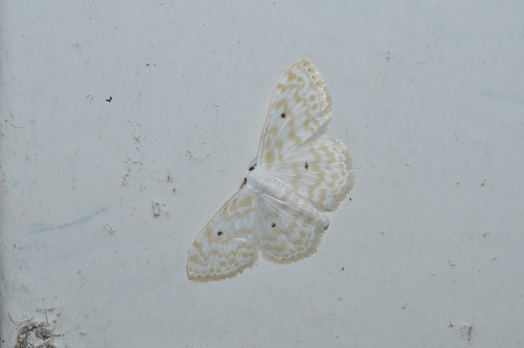 翅の地色は白色で、淡黄褐色のはっきりとした太めの横線が複数あります。地色と横線の色はキナミシロヒメシャクと似た感じがしますが、ウスキトガリヒメシャクの方が横線が太く、前翅、後翅の黒点がよりはっきりしています。