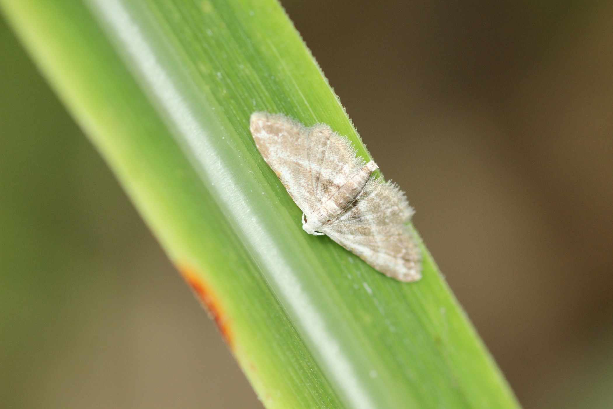 アヤホソコヤガに似ていますが、ちょっと雰囲気が違うので撮影して調べてみると初見のシロホソコヤガでした。淡褐色の地に波曲のない白っぽい横線が走っています。