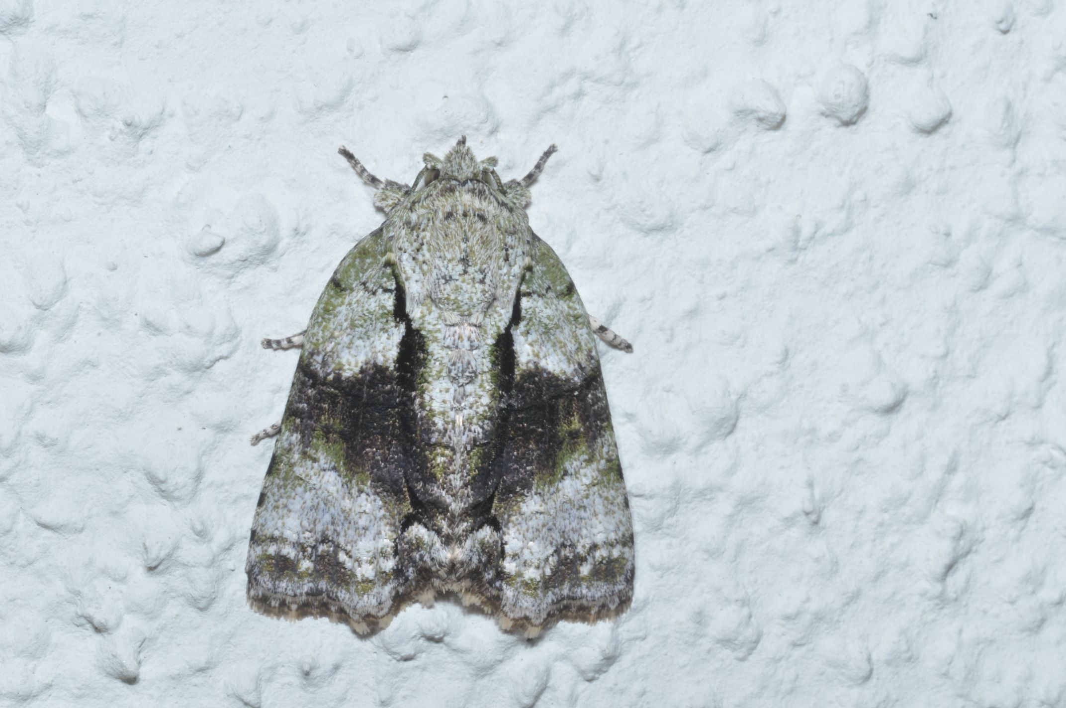 写真の個体は、緑系の色が入り、白っぽい部分が広く比較的明るい色合いですが、全体的に黒っぽい個体もあり、個体によって色彩が大きく異なります。色彩が違っていてもこのような外形をしている近似種がいないので、同定に悩むことはないようです。