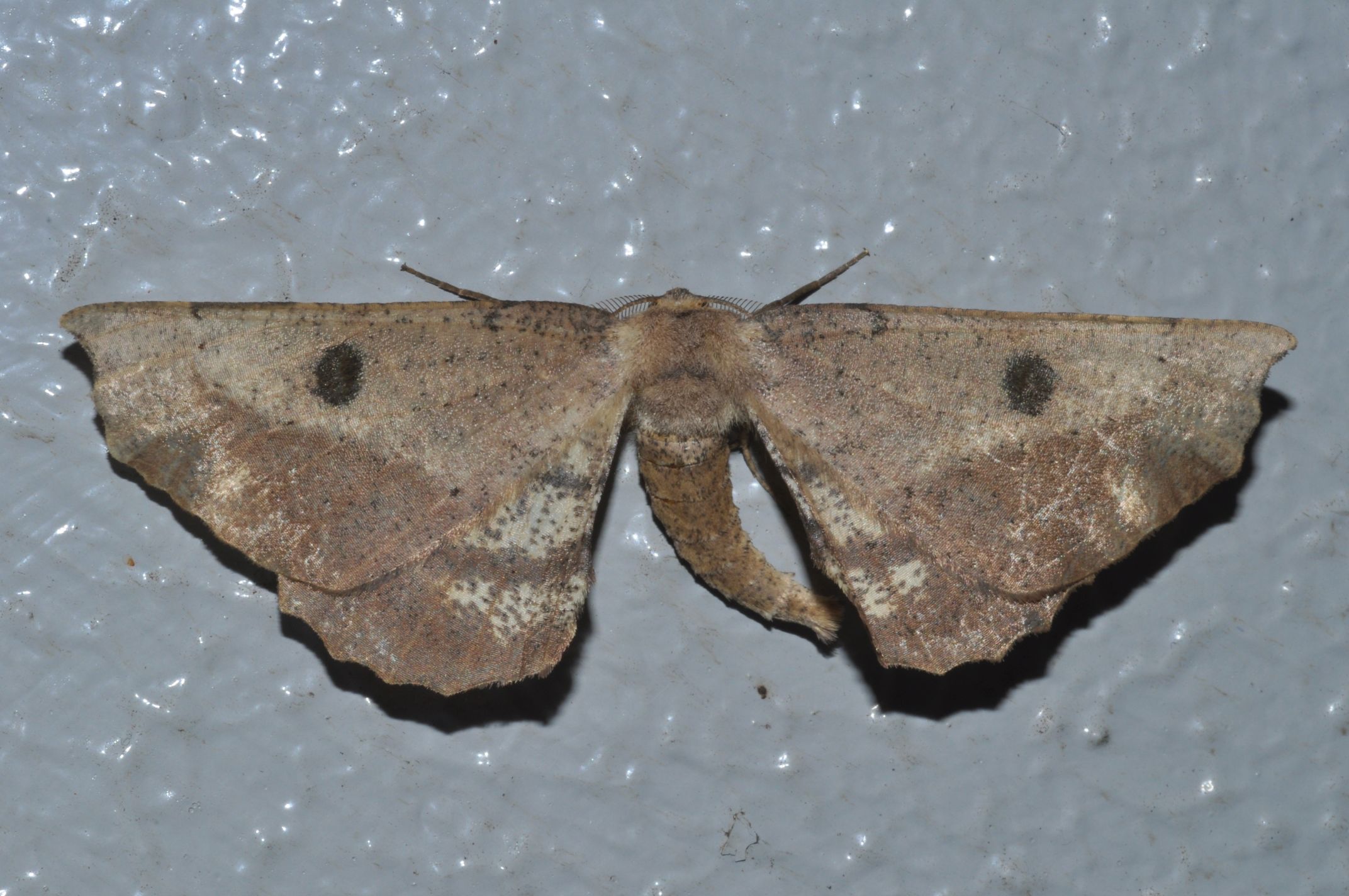 10月中旬から11月上旬の晩秋に出現する蛾です。写真のように腹部を曲げて止まります。比較的大型の種類で、前翅長は写真の個体で約29mmです。