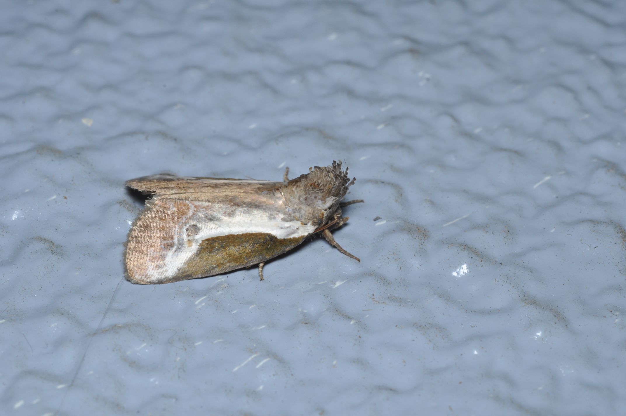 ウンモンキノコヨトウと同じように胸部背面の毛が鳥の冠羽のように立ち上がっています。
