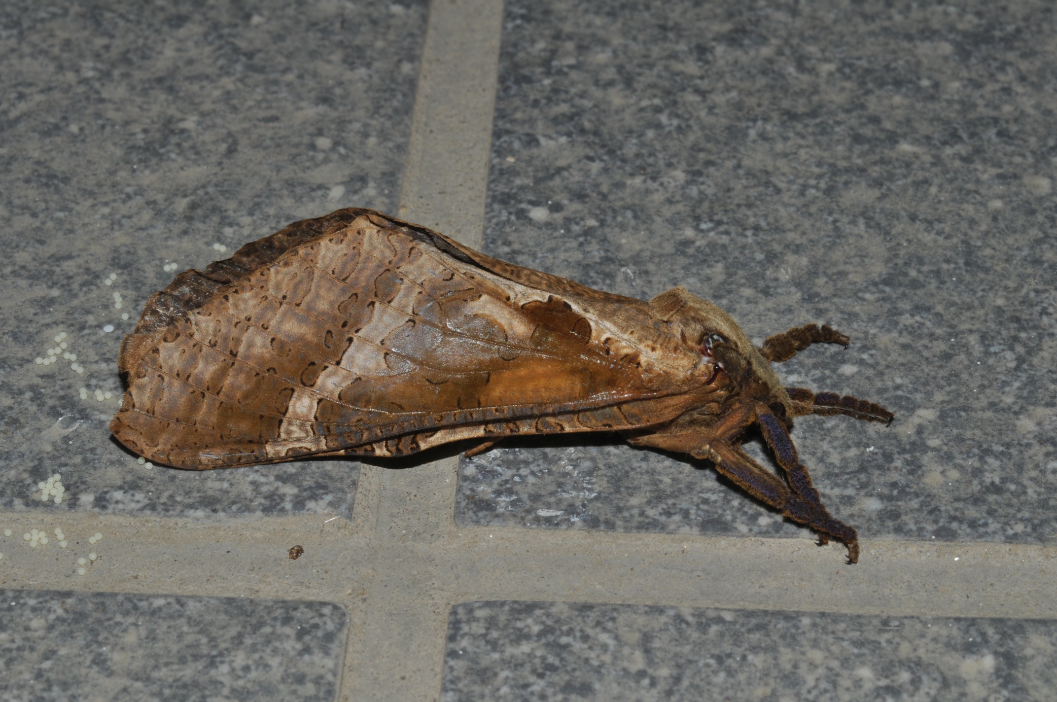 キマダラコウモリに似ていますが、コウモリガには、前翅に白い小さな斑紋がありません。写真の個体はメスのようで、画面左下の部分に産み落とした卵が写っています。
