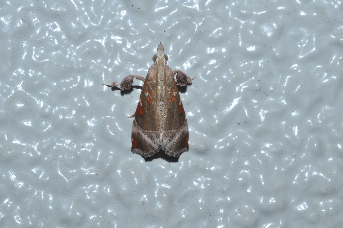 シマメイガの仲間にしてはあまり翅を大きく広げないで止まります。前肢に房状の毛束があります。