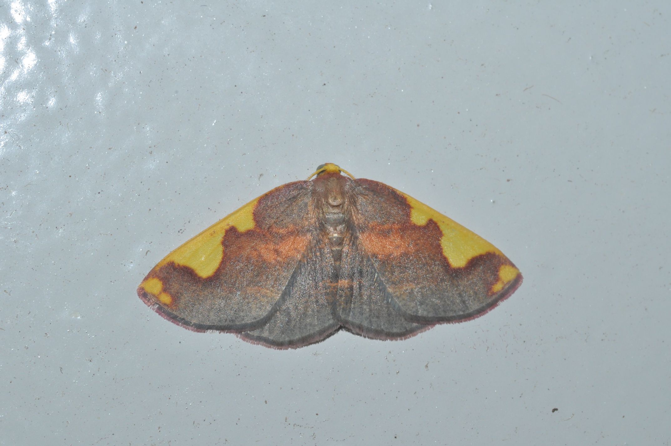 オオマエキトビエダシャクに似ていますが、マエキトビエダシャクでは前翅の前縁の色が付け根から1/4から1/3の範囲では紫褐色ですがオオマエキトビエダシャクでは付け根から黄色です。