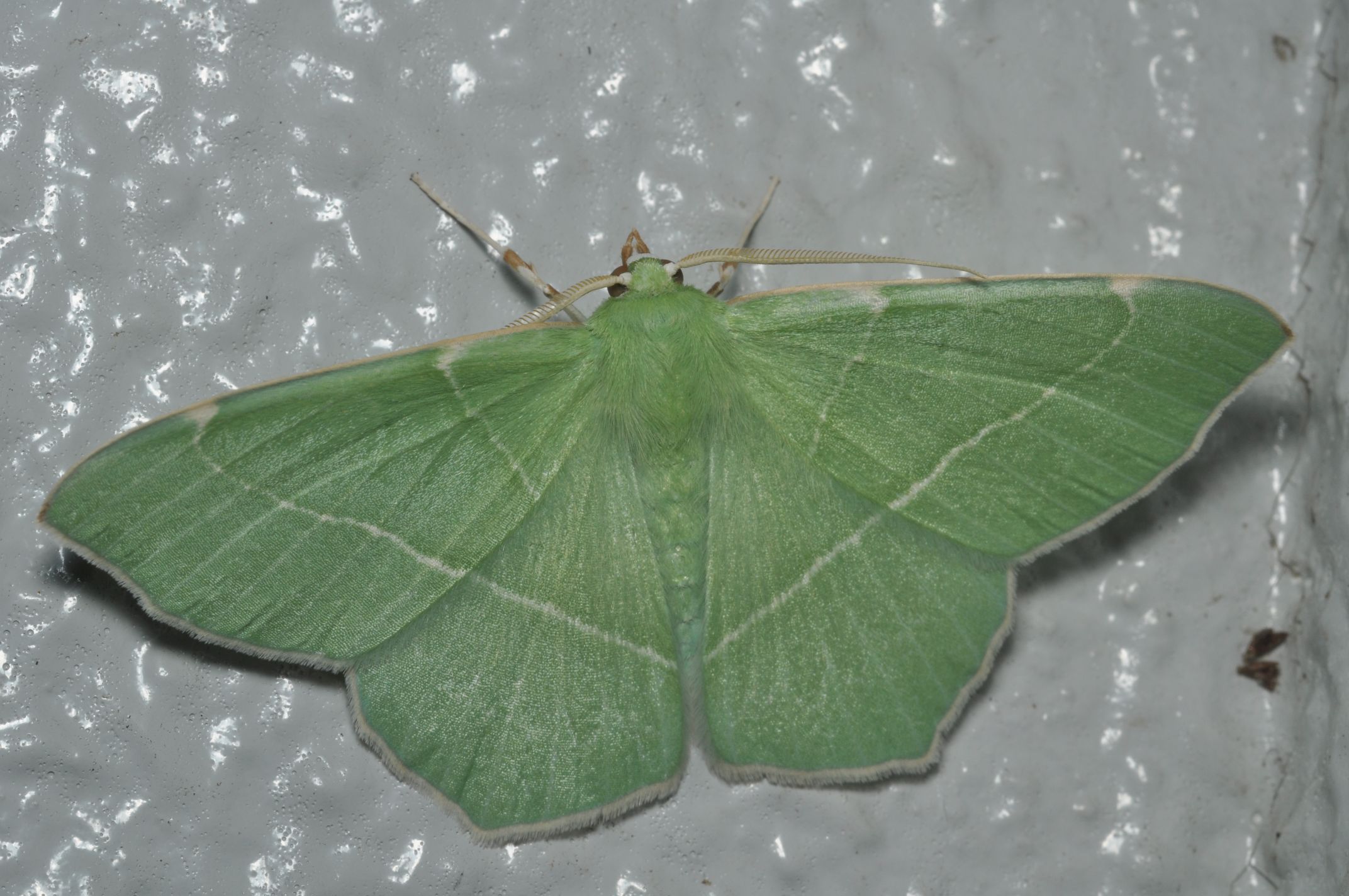 アオシャクの仲間は翅をぴたりと壁に付けて止まる種類が多いですが、カギシロスジアオシャクは前翅を少し浮かせて止まります。