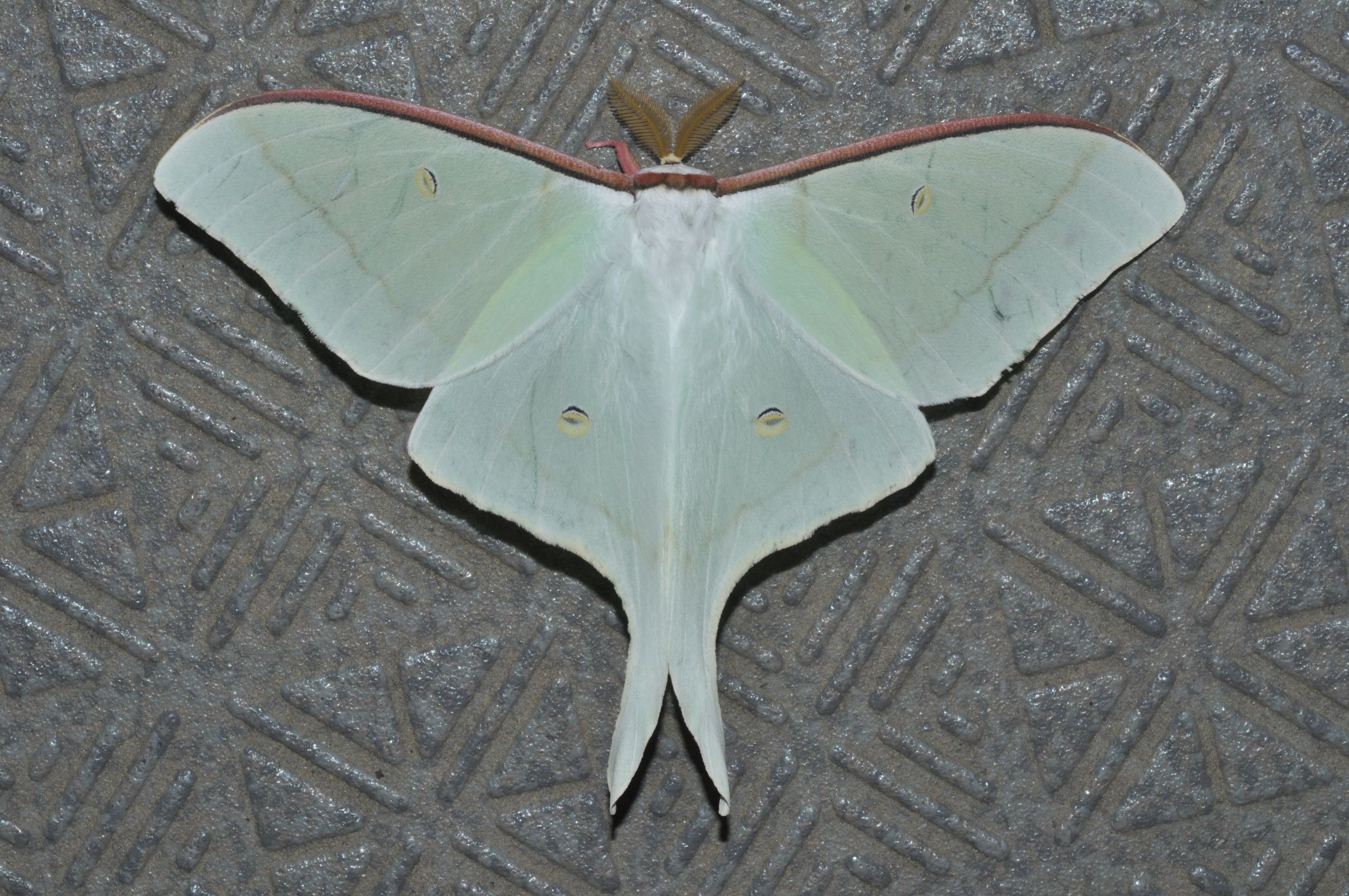 オナガミズアオと良く似ているので、識別が難しいですが、オオミズアオでは、写真のように前翅の翅頂部が丸みをおびていますが、オナガミズアオでは角張っています。