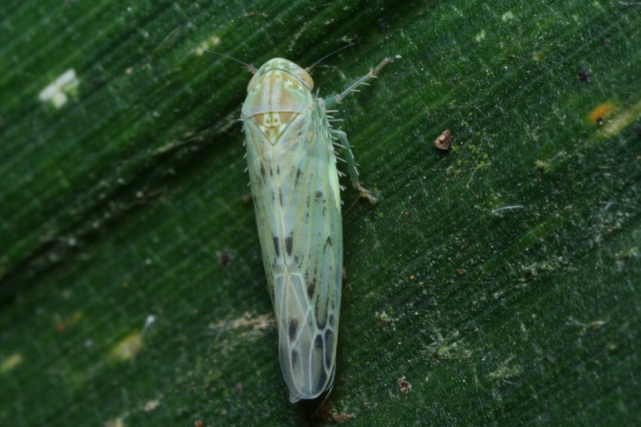 体や前翅が淡緑色のものはかつてウスバミドリヨコバイBalclutha viridisと呼ばれていました。淡緑色型は4-8月に、赤褐色塾は10-2月に多いそうです。写真の個体の体長(翅端まで)は、約4.3mm。