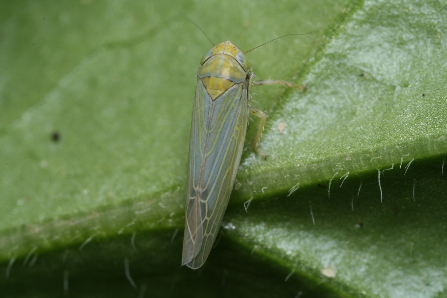くすんだ灰色を帯びた緑色をしており、翅脈がくっきりと目立つヨコバイです。長池公園では、アズマネザサを寄主植物としているようです。写真の個体の体長は腹端まで約5.8mm。