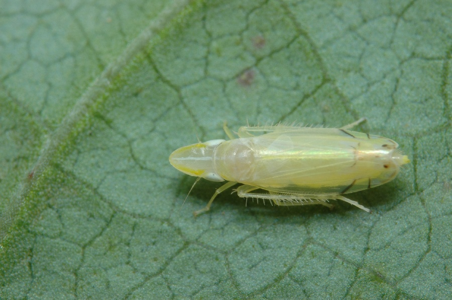 い2本の線が入っています。この日は複数の個体を見かけたので、数は少なくはないようです。クロスジホソサジヨコバイと形は良く似ていますが、背面中央の黒い筋が入っていないので、肉眼でも容易に区別できます。写真の個体の体長は約5.3mm。